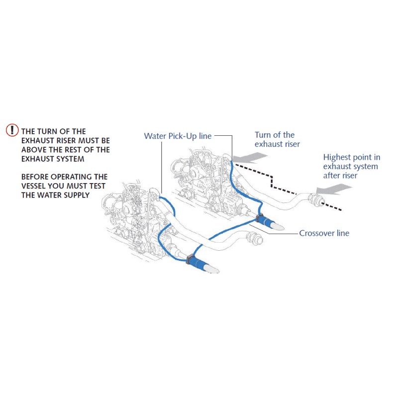 6A. For twin-engine applications, we recommened the use of a crossover line between port and starboard SureSeals to insure proper lubrication and cooling water to both seals in the event that only one engine is running. Before installing a crossover line, you must inspect the vessel’s raw water exhaust system. DO NOT USE A CROSSOVER LINE if the highest point in the exhaust system is above the turn of the exhaust riser. “back flow” could occur while running on only one engine causing serious damage to the other engine/turbo. For all Crossover setups, a second fitting is required on each SureSeal.