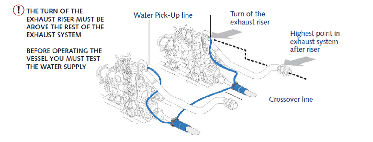 In twin engine applications using water lift mufflers, a check valve in each water pick-up line is required if a crossover line is installed.