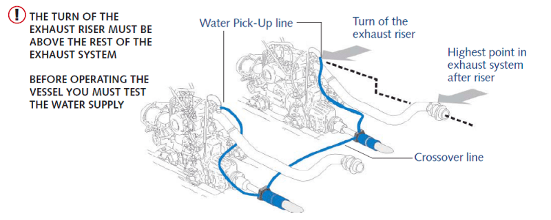When the engine (or engines) are located below the waterline OR water lift mufflers are installed, a vented loop may be required to prevent back-flooding of water through the exhaust system and into the engine(s). ABYC guidelines regarding vented loop materials and installation practices should be followed.