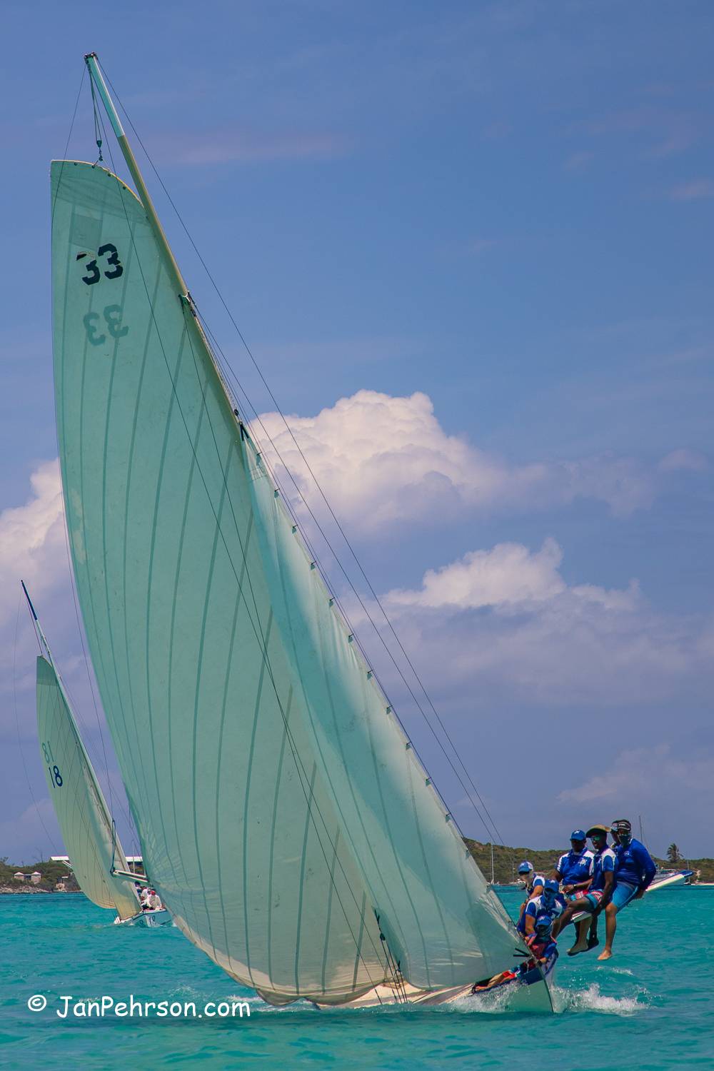 As you can see from this photo of Tari Anne, Bahamian sloops have a lot of power due to the huge sail area. The main sail is not easy to get up and down!